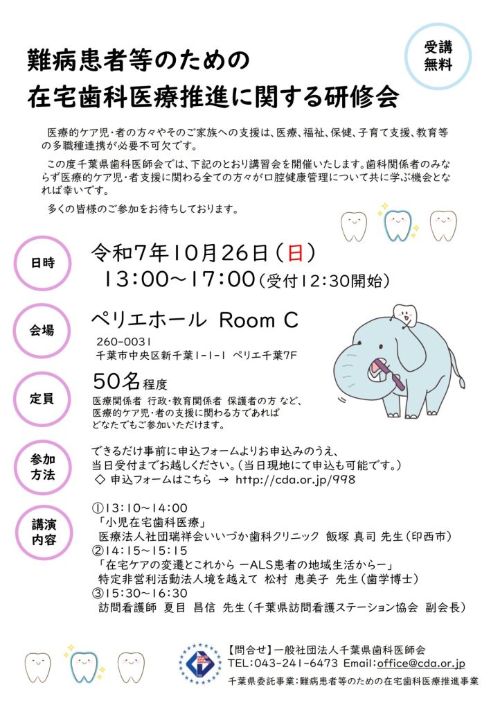 この度、千葉県歯科医師会では、下記のとおり講習会を開催いたします。歯科関係者のみならず医療的ケア児・者支援に関わる全ての方々が口腔健康管理について共に学ぶ機会となれば幸いです。